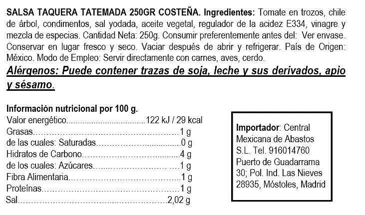 La salsa taquera está elaborada con: chiles de árbol y jalapeños, acompañados de tomate, cebolla y cilantro perfectamente molidos y sazonados con todo el sabor de la tradicional cocina mexicana, hacen de la Salsa Taquera el perfecto acompañante de tus platillos. Botella de cristal de 250 gr
