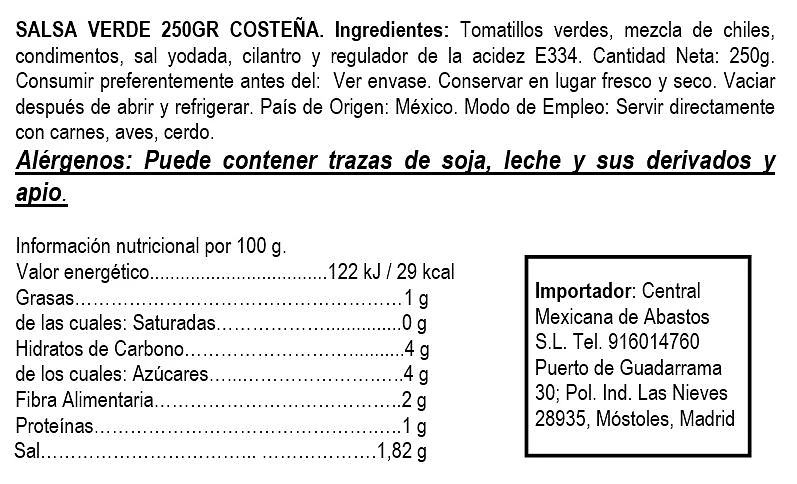 La salsa verde está hecha de la siguiente forma: salsa cocida de tomate verde, cebolla, ajo, cilantro y chile serrano.Con ella puedes acompañar diferentes platos.¡Su sabor hará que quieras ponerle salsa verde a todo!Botella de cristal de 250 gr